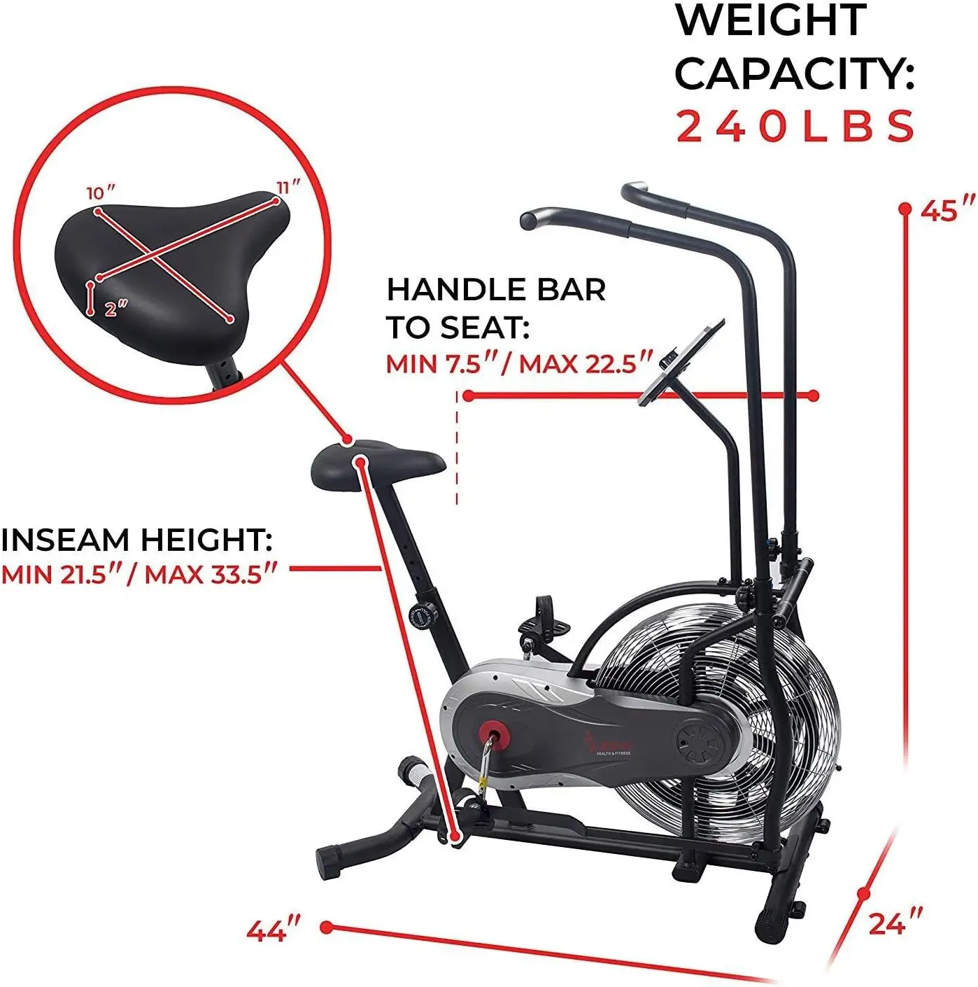 Build Endurance And Stamina With The Air Bike By Maykoosh Air Resistance Technology Timeless Tradition s Higher Resistance Making This Workout Machine Low Impact Yet Completely Intense Achieve A Full Body Workout When Utilizing The Arm Resistance Handlebars While Cycling Track All Of Your Fitness Results On The Digital Monitor Experience Superior Comfort On The Bike With Features Which Include Padded Seating Adjustable Seat And Pedals And Rubber Foam Handles The Bike Measures At A Convenient 44L X 24W X 45H Inches Achieve An Incredible Workout On The Air Bike The Bike Built To Take Punishment